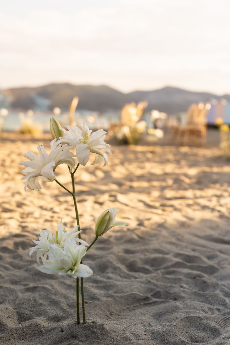 La loro cerimonia civile di matrimonio si svolge letteralmente in riva al mare, tutti gli invitati tolgono le scarpe e prendono posto tra le sedie che affondano nella sabbia e i fiori bianchi che ricordano la vegetazione spontanea che cresce spontanea in alcune spiagge della Sardegna.